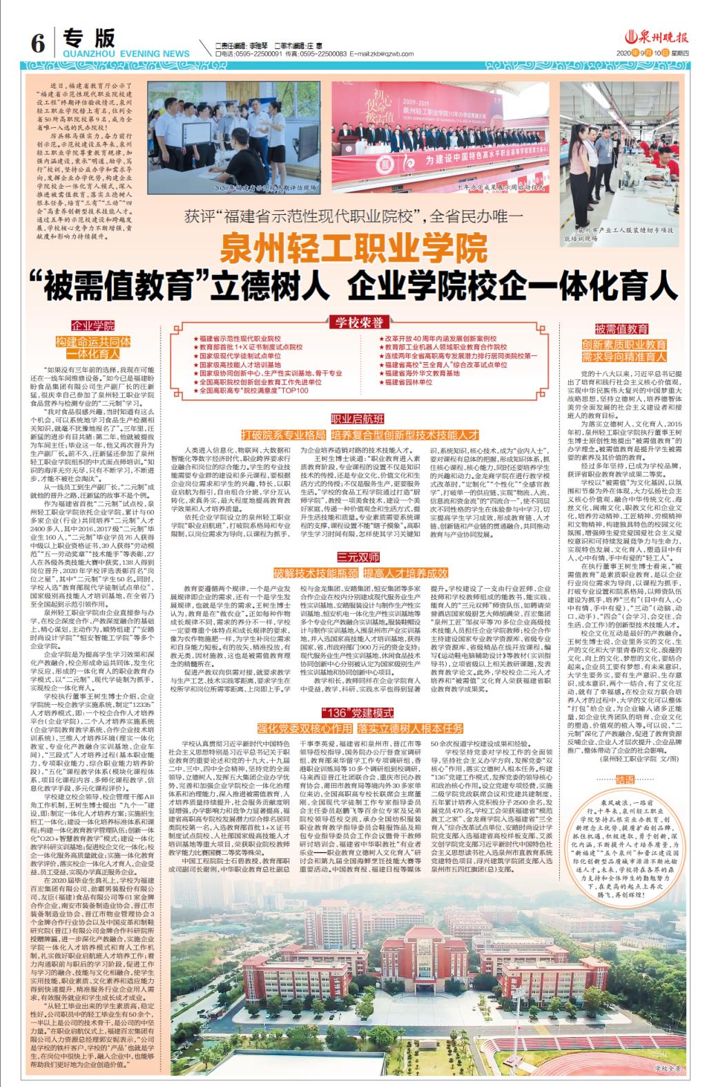 9月10日,《泉州晚报》以“88038威尼斯检测中心(中国)有限公司官网:‘被需值教育’立德树人 企业学院校企一体化育人”为题,专题报道我校获评“福建省示范性现代职业院校”,详细解读我校坚持公益办学和需求导向,发挥企业办学优势,构建企业学院校企一体化育人模式,深入推进被需值教育,落实立德树人根本任务,培育“三有”“三动”“四会”高素养创新型技术技能人才的经验做法。