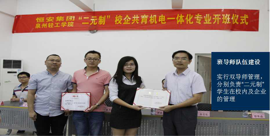 以产业、行业企业发展需求为出发点,依托恒安集团主营行业智能化生产,组建深度融合恒安智能工学院。成立产业学院理事会,由林松柏校长作理事长,恒安集团副总裁刘莹担任副理事长,同时实施“双院长”(学院院长+企业人力资源总监)、“双带头人”(学校省级机电专业带头人+企业技术总监)制,并建立由专业教师、企业人员组成的专业建设工作小组。