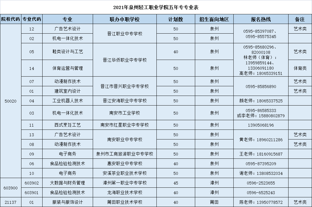 我校与晋江职业中专学校、晋江华侨职业中专学校、晋江晋兴职业中专学校、晋江安海职业中专学校、南安市工业学校、南安职业中专学校、南安市红星职业中专学校、惠安职业中专学校、泉州市工商旅游职业中专学校、漳州第一职业中专学校、安溪茶业职业技术学校、龙海职业技术学校、莆田职业技术学校等13所中职学校合作,设有广告艺术设计、机电一体化技术、鞋类设计与工艺、服装与服饰设计、体育运营与管理、动漫制作技术、建筑室内设计、工业机器人技术、西式烹饪工艺、食品检验检测技术、电子商务、大数据与财务管理等专业进行招生,具体招生学校及招生计划如下——