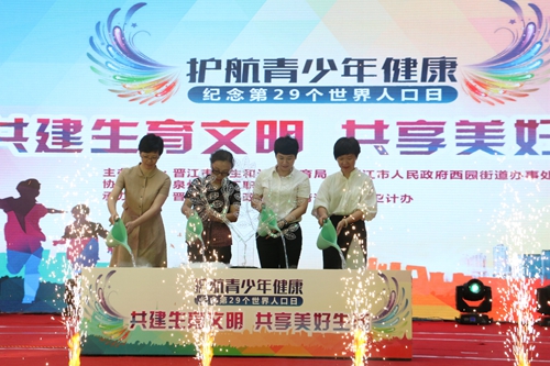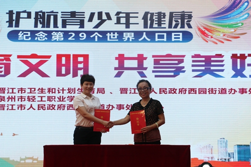 7月10日,晋江市“7·11”世界人口日活动暨“共建生育文明 共享美好生活”——-护航青少年系列活动启动仪式在我校举行。 西园街道办事处主任杨双华、晋江市卫计局副局长张白茹、西园街道党工委副书记刘小燕、我校副校长王艳君以及西园街道的60组计生家庭共同参加了启动仪式。