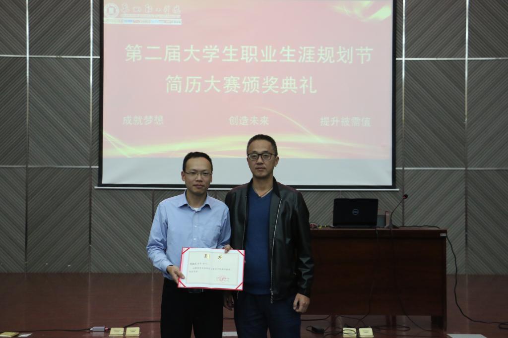 讲座后,我校王勇副校长为陈德祥总监颁发客座教授证书并且为简历大赛的一等奖参赛选手颁发证书。