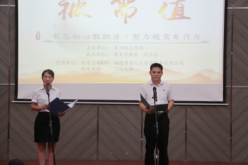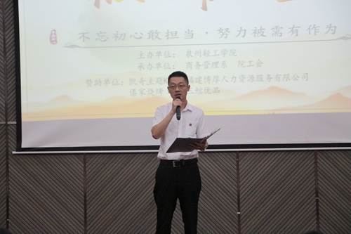 6月12日,由商务管理系与学院工会联合举办的“不忘初心敢担当、努力被需有作为”为主题的师生演讲暨朗诵比赛在四楼学术报告厅举行。凯奇主题KTV总经理黄坤灵、福建博厚人力资源有限公司副总经理罗妙玲,副院长王勇、宣招处处长孙玉东、图书馆副馆长黄共国、就业指导中心副主任许新建等老师出席了大赛。