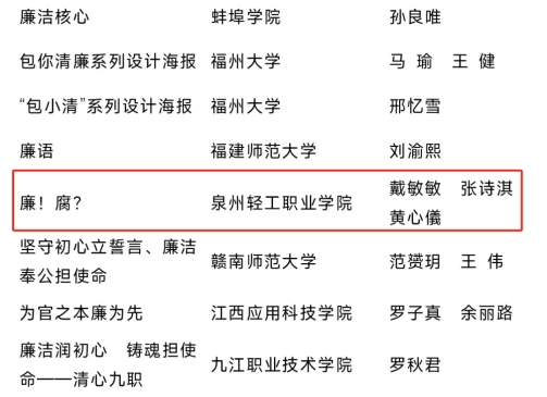 日前,教育部思想政治工作司公布第八届高校廉洁教育系列活动“清心妙语”创意征集遴选名单,由我校文创学院戴敏敏、张诗淇、黄心儀同学创作,张登彬、何婷婷老师指导的作品《廉!腐?》成功入选。据悉,本次全国共有346所高校入选,我校是福建省唯一一所入选的民办高职院校。